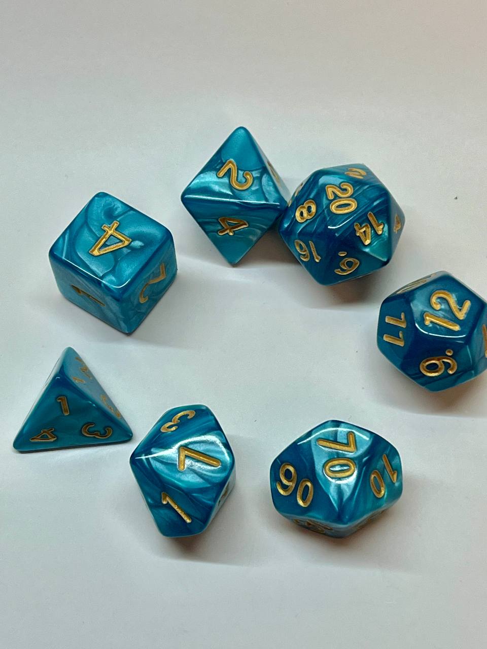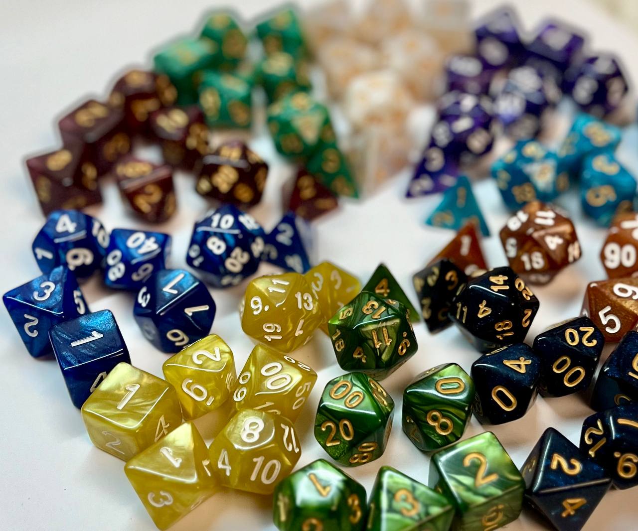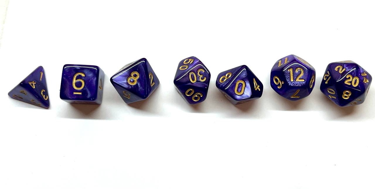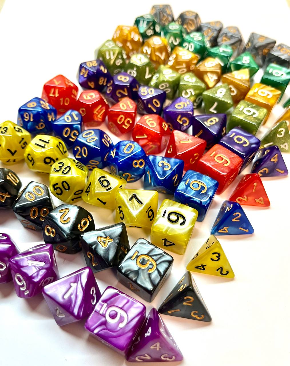 Dice set for your board games that consists of 7 different cubes in a fabric bag for your convenience. Sizes: D4, D6, D8, D10, D12, D20 and 100 (10,20,30,40,etc). The variety of colours available.