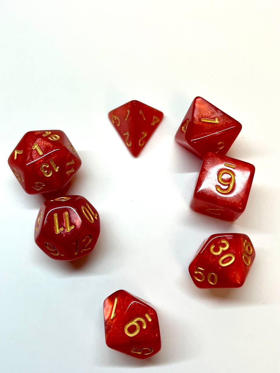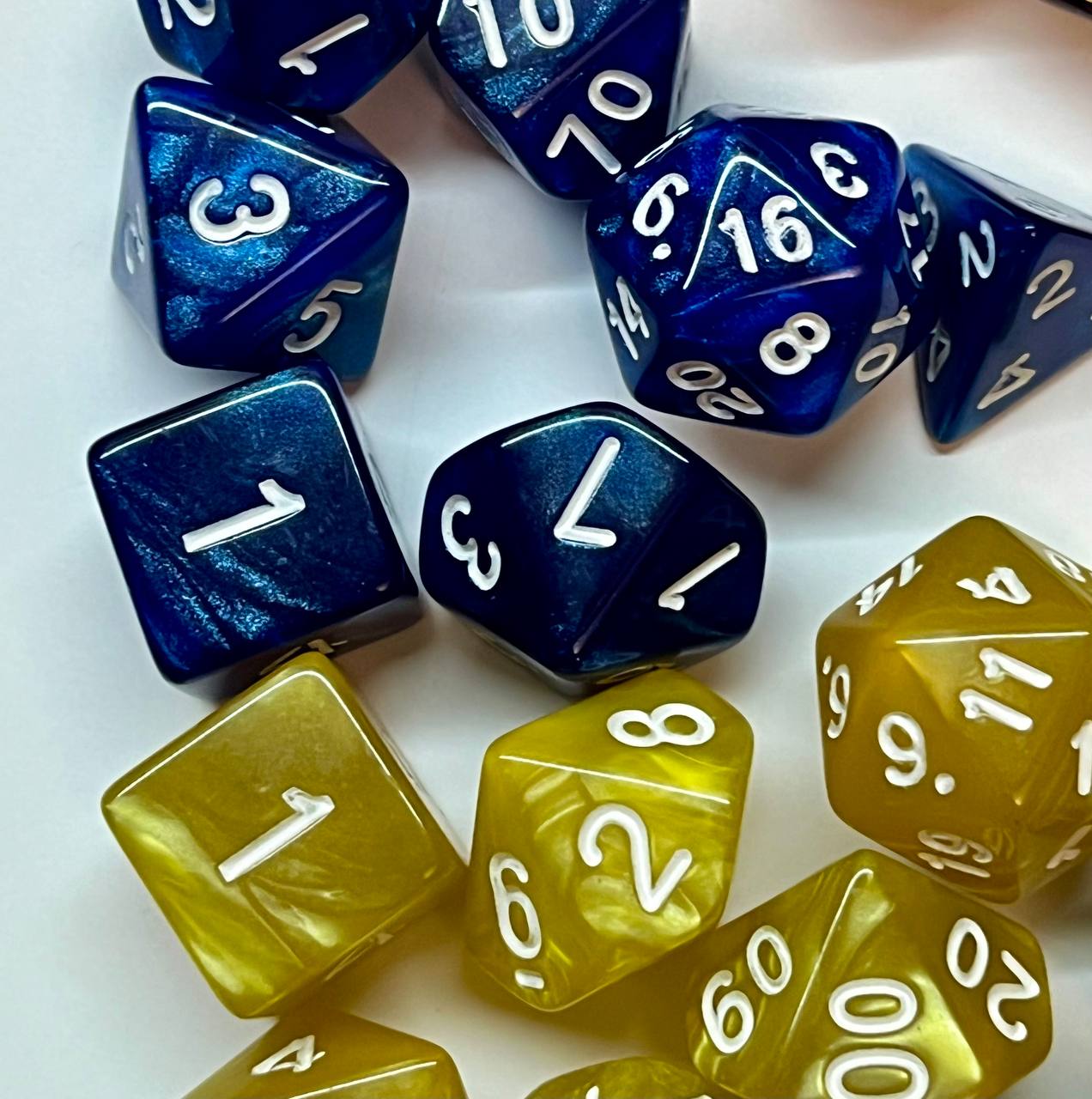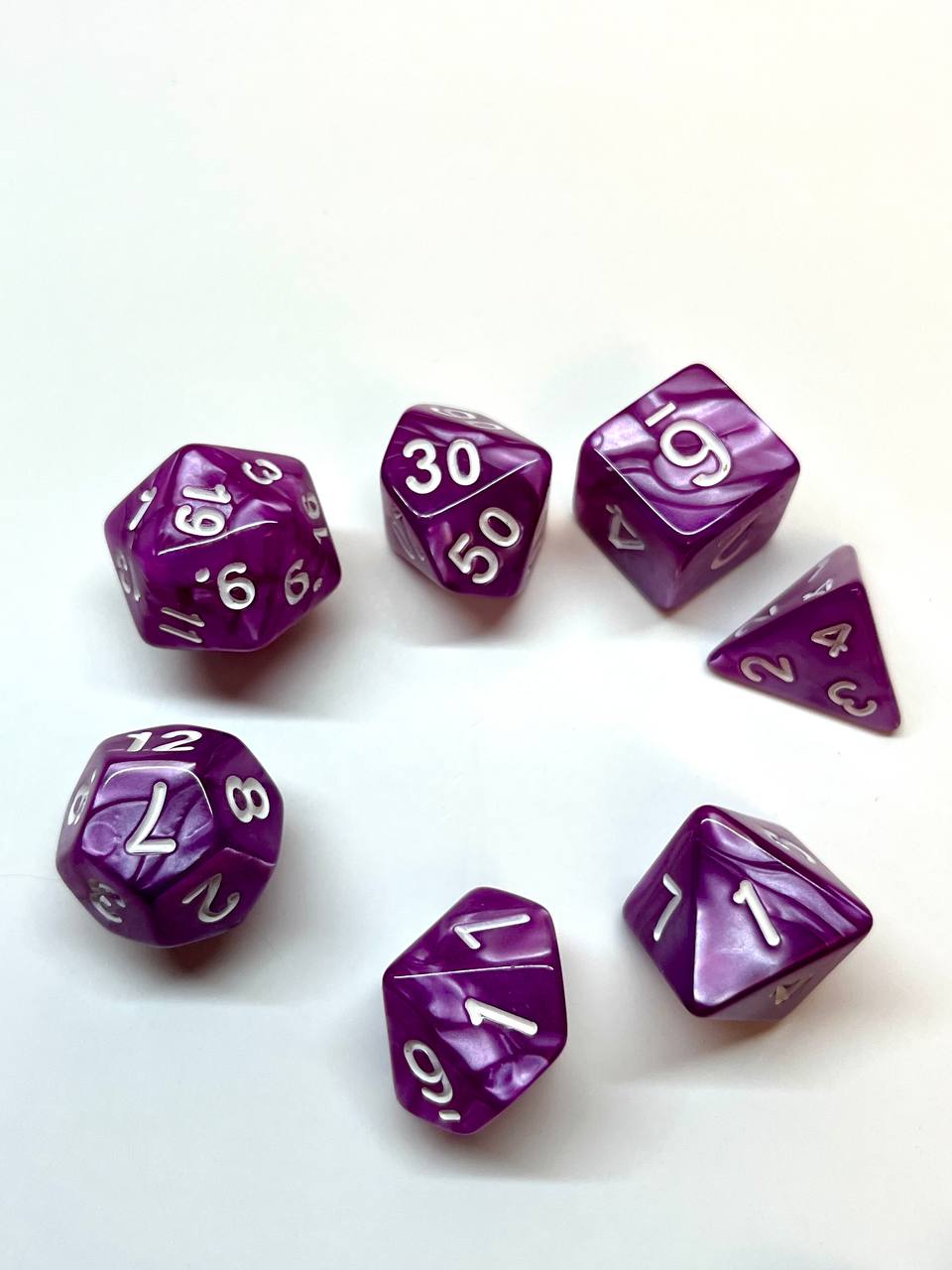 Dice set for your board games that consists of 7 different cubes in a fabric bag for your convenience. Sizes: D4, D6, D8, D10, D12, D20 and 100 (10,20,30,40,etc). The variety of colours available.